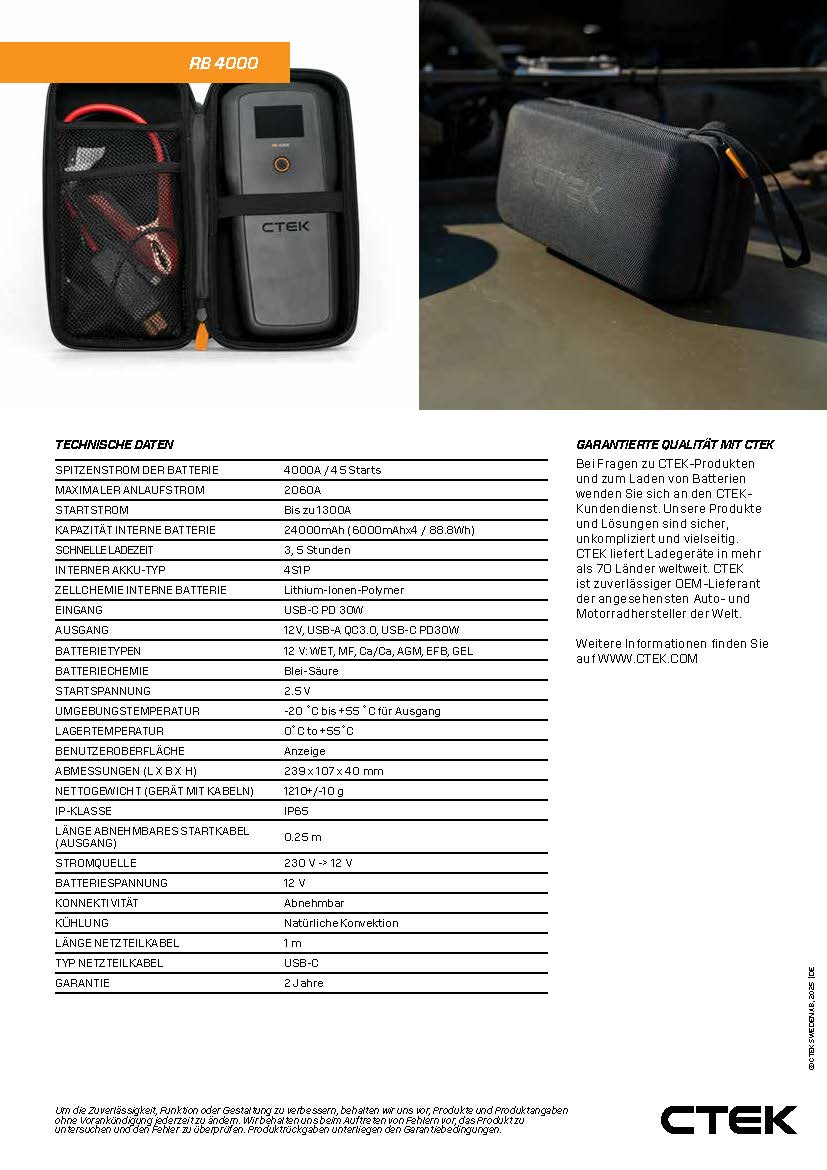 Lernen Sie den leistungsstarken tragbaren Booster RB 4000 kennen. Mit seiner kompakten Größe und einer Batteriespitzenstromstärke von 4000 A ist es in der Lage, den meisten 12-V-Batterien problemlos Starthilfe zu geben. Es verfügt über fortschrittliche Sicherheitsfunktionen, einschließlich funkensicherer Technologie und Verpolungsschutz, so dass Sie es bedenkenlos verwenden können, um zu starten. Aber es ist mehr als nur ein Starthilfegerät. Er ist außerdem eine vielseitige, langlebige Powerbank mit USB-Ladeanschlüssen für alle Ihre Geräte und verfügt über eine integrierte LED-Taschenlampe mit drei Leuchtmodi. Sie werden keinen Moment verpassen, wo Sie das Abenteuer auch hinführt – Unbeschwertheit, die die schwedischen Ladepioniere CTEK bieten.